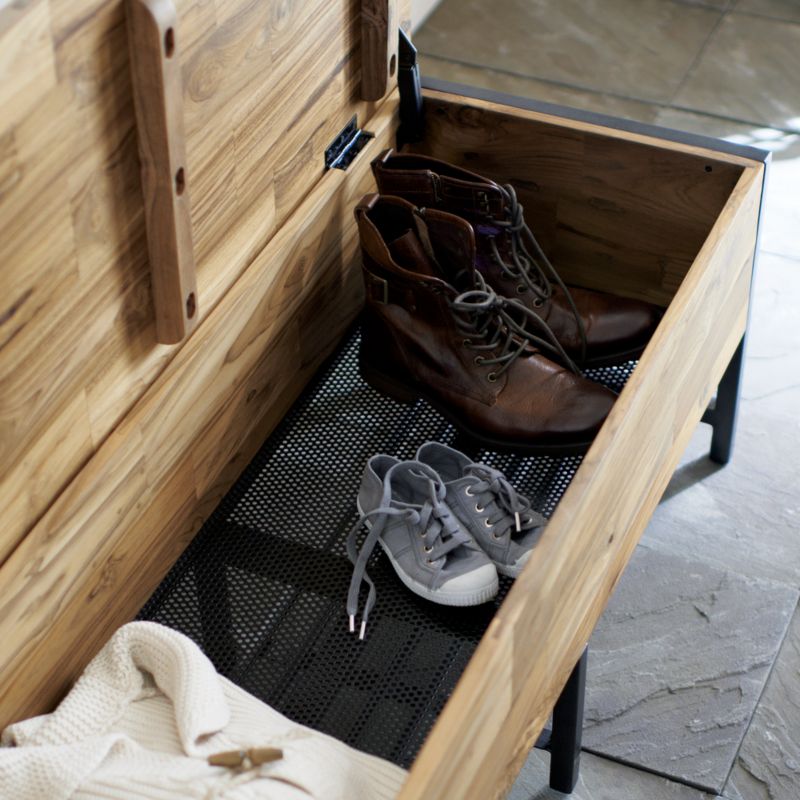 Teca's gorgeous recycled teak and iron poses the perfect solution to runaway shoes, sporting equipment and outdoor gear.