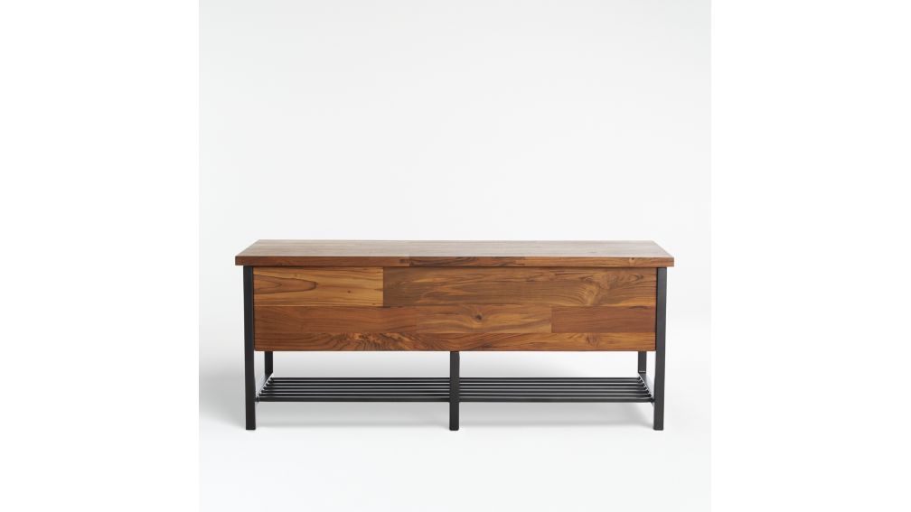 The trunk's perforated metal floor provides air flow for airing out stored items and a handy slatted shelf sits below for storing shoes and boots. The trunk's perforated metal floor provides air flow for airing out stored items and a handy slatted shelf sits below for storing teca's gorgeous recycled teak and iron poses the perfect solution to runaway shoes, sporting equipment and outdoor gear. 48wx18dx18h solid acacia wood with brown stain plastic levelers safety hinges clean with soft cloth made in india. Our storage & organization category offers a great selection of storage trunks and more. Pink purple red silver white yellow accent stools benches decorative storage cabinets decorative storage drawers dining benches entryway benches glider ottomans ottomans sleeper ottomans storage benches storage chests storage ottomans.
